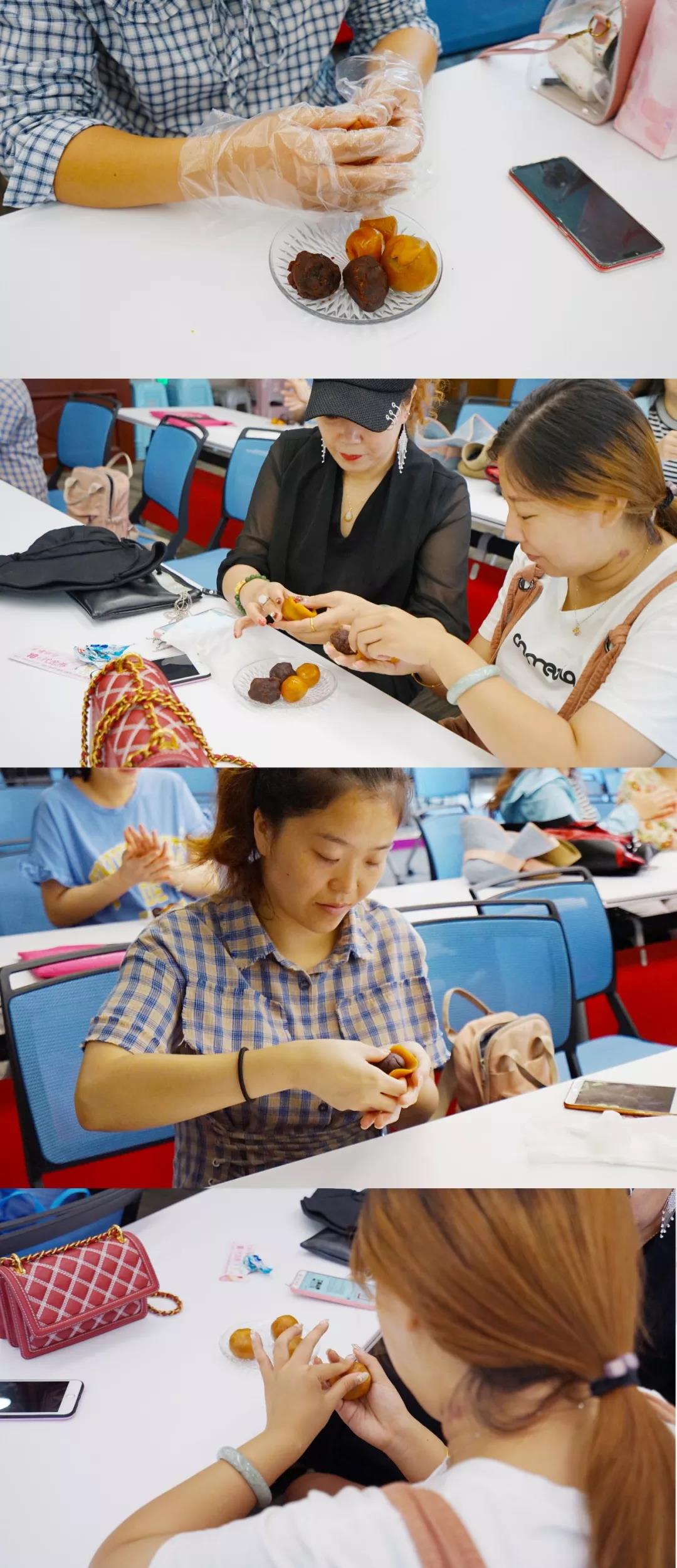 将馅皮原料揉圆捏扁,放入馅料,用虎口小心的把面皮收好口,然后再搓成一个“小团子”……不算复杂的制作工序,每个准妈妈都做得格外专心,把对家人的美好期盼和祝福都包进了这个小小的“团子“里。