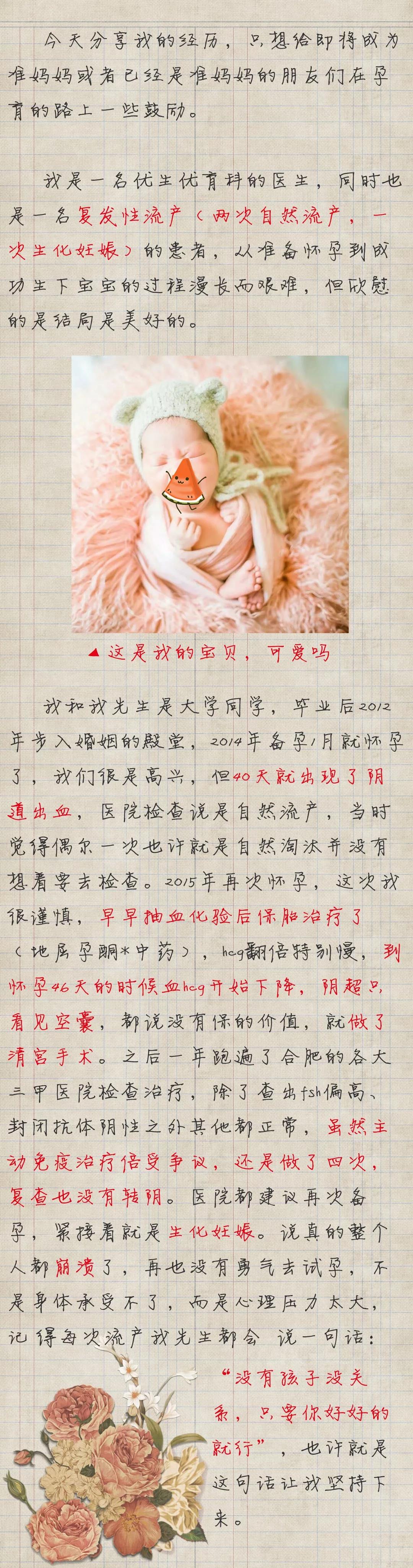 两次自然流产,一次生化妊娠,两次试管婴儿移植,又经历了漫漫保胎路,最终在和平与宝宝相遇…… 这位在孕育路上历经坎坷而又愈挫愈勇的年轻妈妈,正是我们今天的主角。她特意将自己的心路历程分享出来,希望给更多像她这样的妈妈们继续前行的勇气!