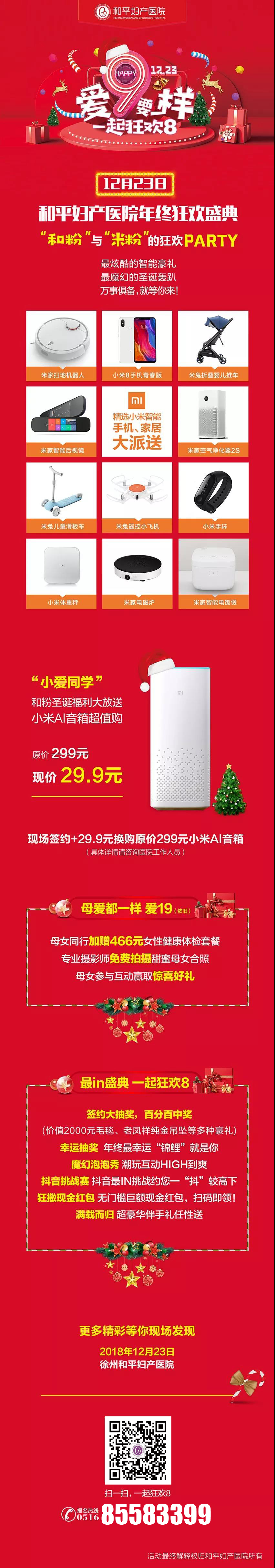 活动现场充值产后康复套餐送钱、送豪礼!全款预约分娩/月子房间,即可参与签约抽奖,百分百中奖!2000元精美毛毯套盒、老凤祥金花生黄金吊坠、小米8青春版手机、米兔遥控小飞机、小米米家后视镜行车记录仪、米兔儿童滑板车、小米运动手环等百余件豪华大礼等您拿!全款预定再送丰厚好礼!现场签约即有机会超值29.9元换购原价299元的小米AI音箱!这么丰厚的福利还等什么?!速速报名!