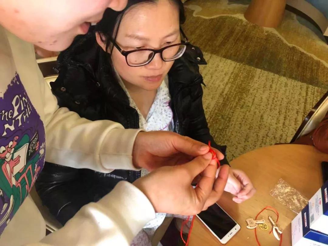 纤细的红绳,小巧的吊坠,在一个个心灵手巧的宝妈们手上自如翻飞着,不多时就现出了“平安扣”的雏形。看得出里面都包含着妈妈们满满的爱意呀!