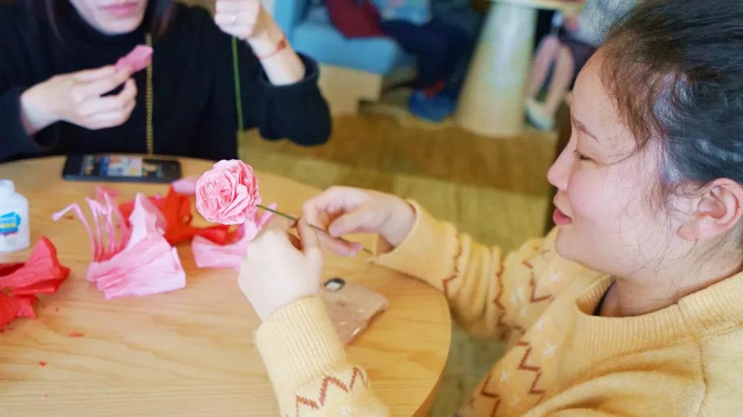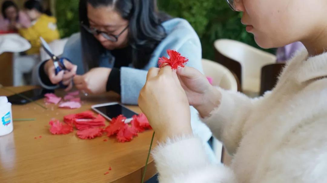 在和平准爸妈学校的手工课上,准妈妈们专心地亲手制作康乃馨,女神节,送自己一朵花吧~