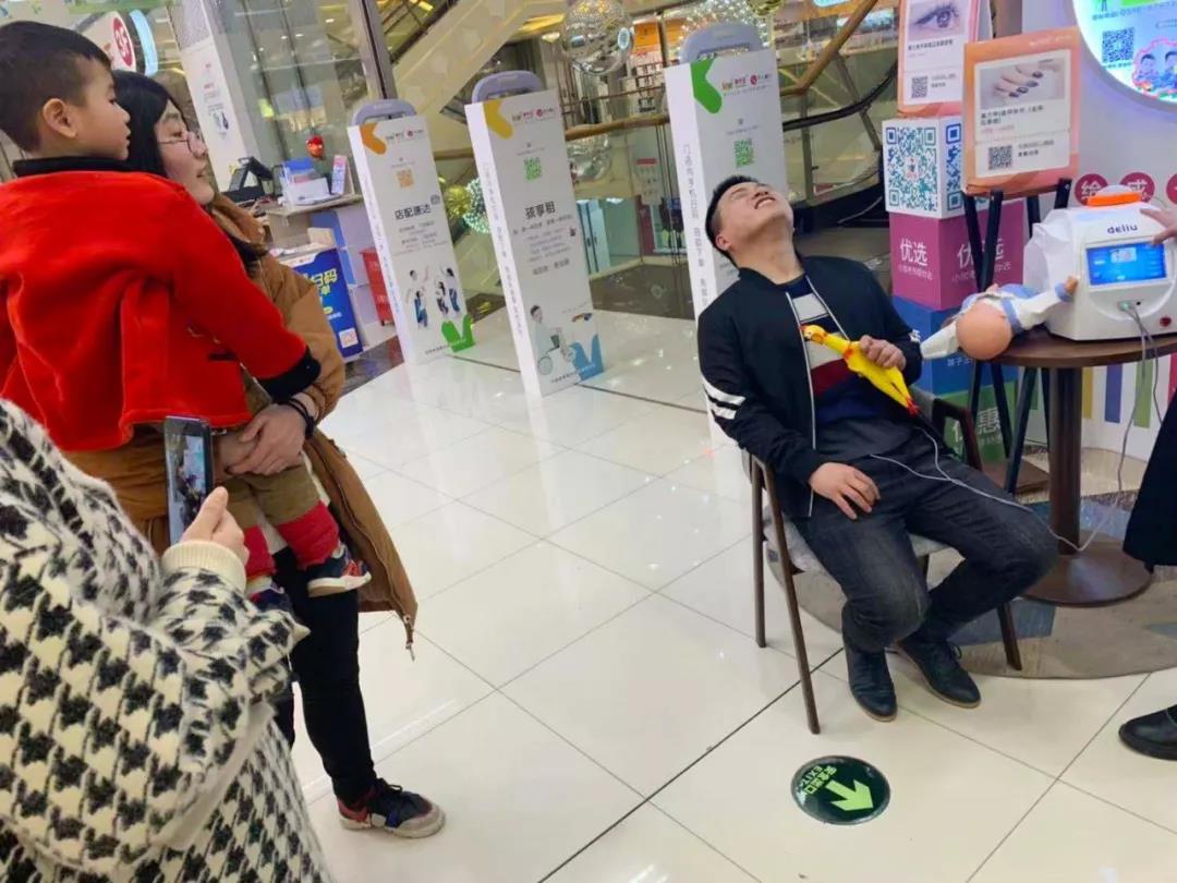 在云龙万达的活动中,和平妇产工作人员现场准备了分娩体验仪,多位准爸爸前来进行分娩镇痛体验,感受准妈妈分娩时的痛楚。