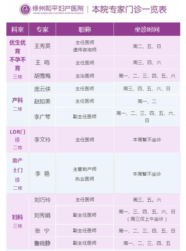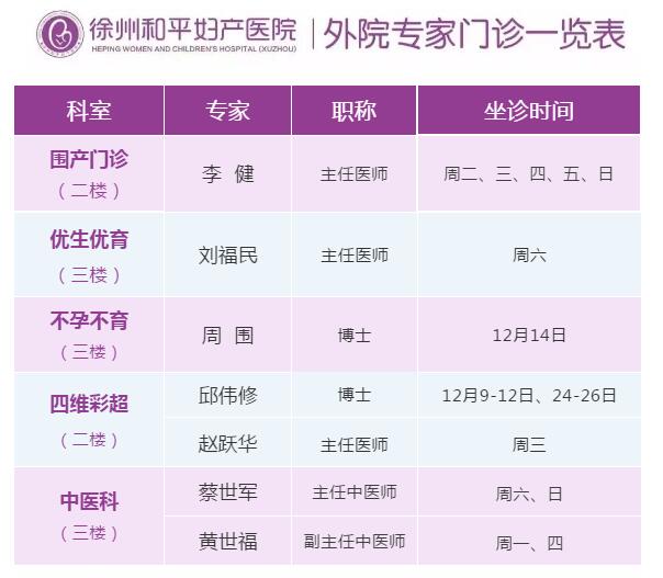 徐州和平妇产医院2019年12月9日—12月15日专家坐诊时间表,有需要的亲,赶紧预约哦~~