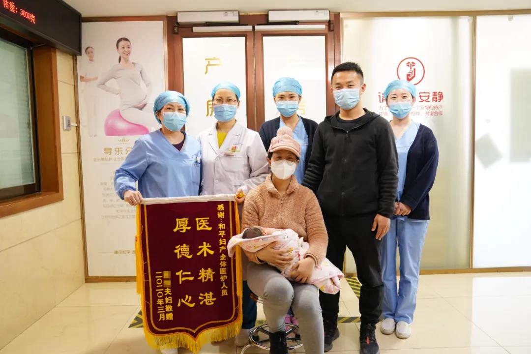 导乐师的陪伴让小颖缓解了很多分娩的痛苦,而姜翠玲主任和多位助产士也用专业又耐心的服务让小颖倍感温暖。小颖这次和家人来到和平,就是特地为了送上锦旗,感谢产房全体医护人员!