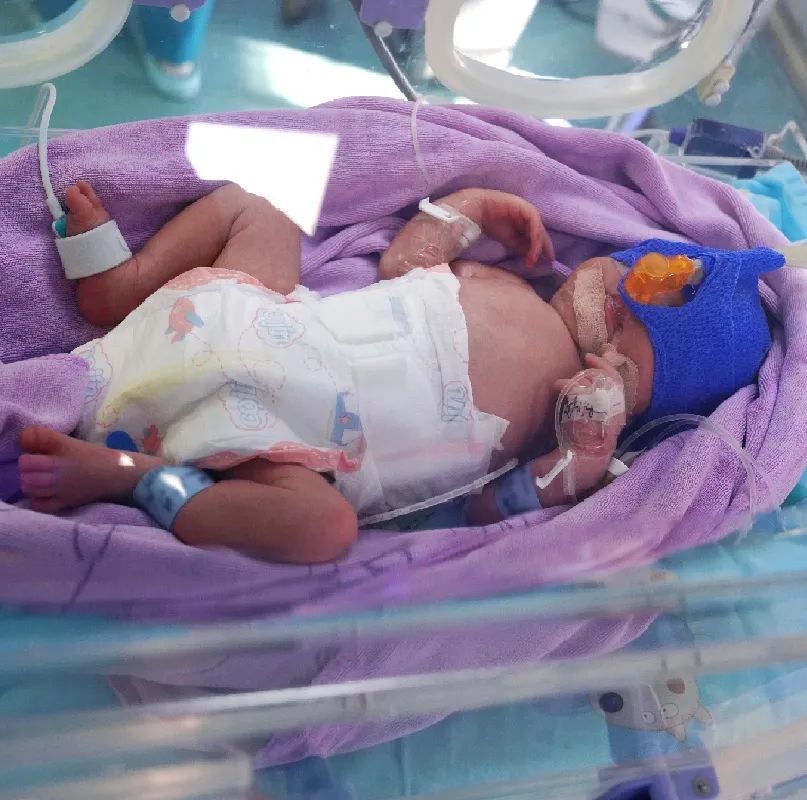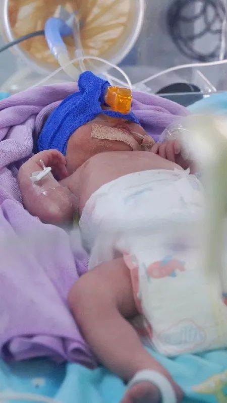 因为宝宝胎龄小,出生的时候不仅体重低,还出现了新生儿呼吸窘迫综合征,出生后呼吸急促费力,哭声也比较弱,医护人员紧急为宝宝进行了气管插管、注入猪肺磷脂注射液、正压通气等措施,宝宝呼吸急促稍有好转,为了保证宝宝的安全健康,随即又将她转入了NICU(新生儿重症监护室)。