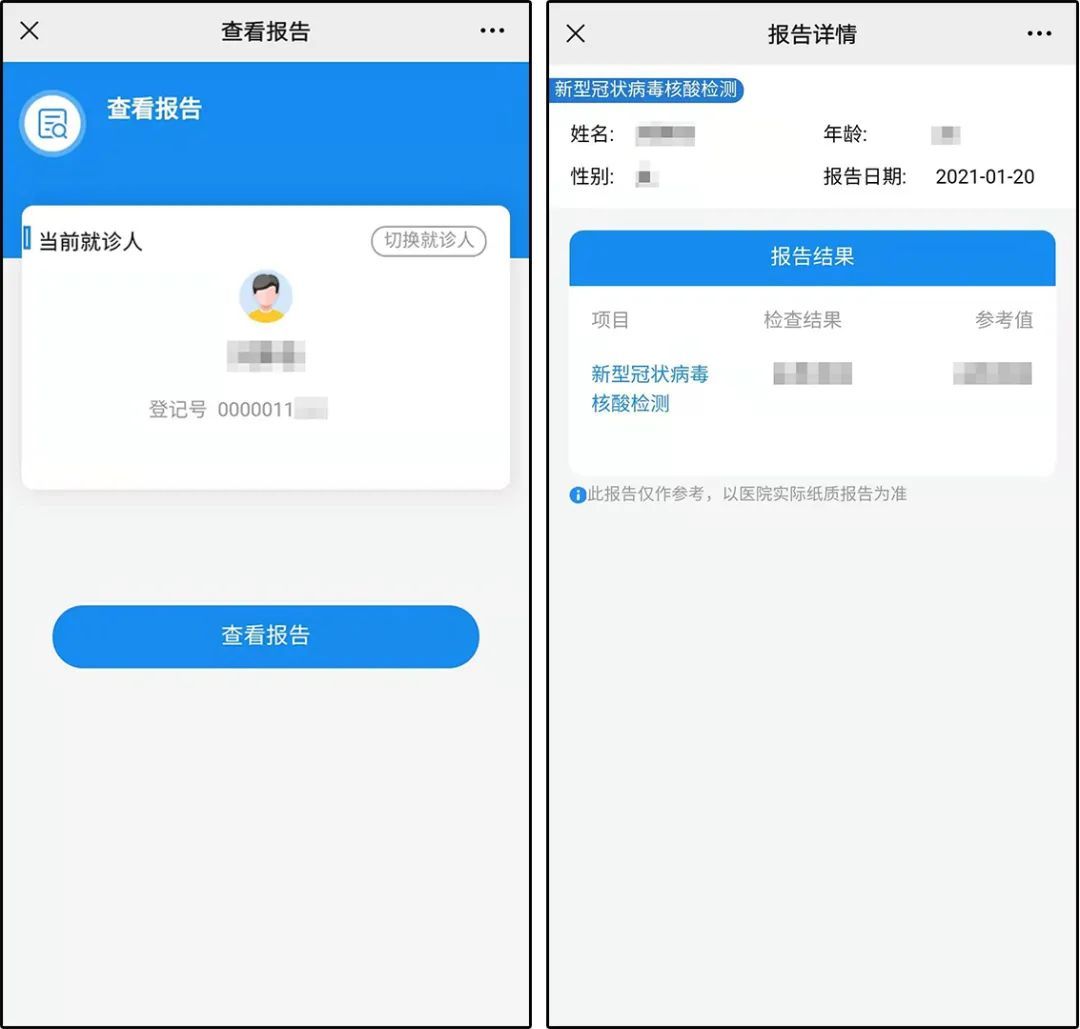除了一般的检查报告单,我们的核酸检测报告也可以在这里一同查询哦!