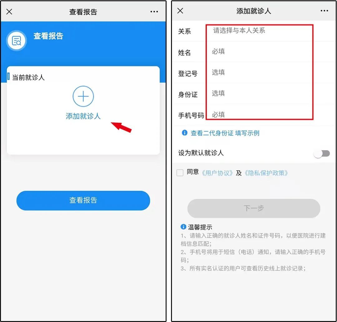 添加“就诊人”信息,根据界面提示完善相关内容。身份证和登记号可选填,若患者历史就诊时未填报身份证(如儿童),可填写登记号。
