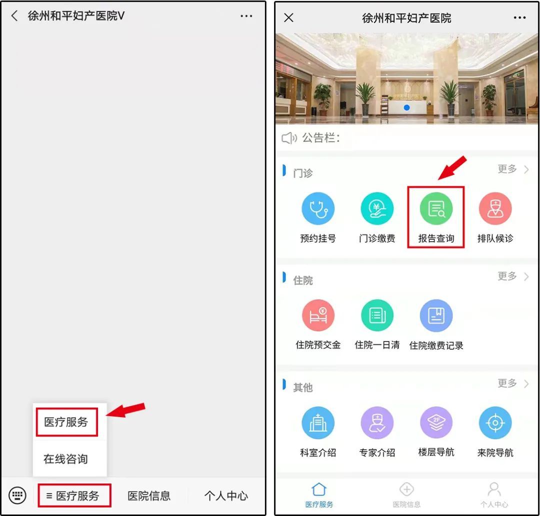 扫描二维码或者微信搜索“徐州和平妇产医院V”,关注服务号。
