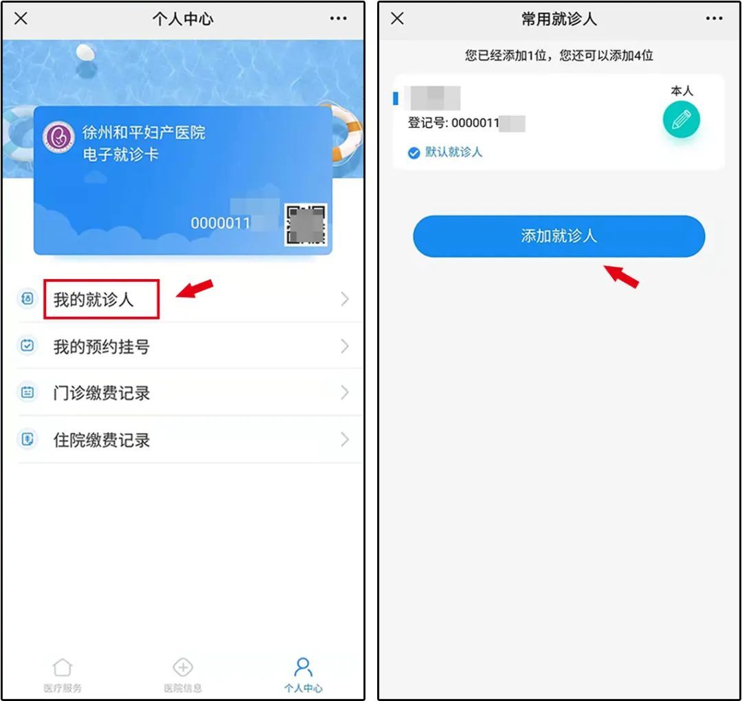 首次使用智慧医疗平台的患者,需要先在【个人中心】添加就诊人信息。